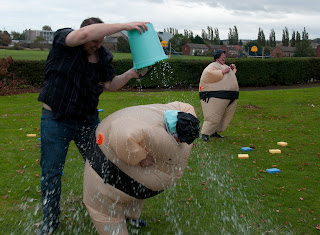 One of the highlights of the day was “Splat the Judge”. Championship Show judges, Eve Smail and Astrid Ogilvie had volunteered to be pelted with wet sponges. People were queuing up for the opportunity to soak these two ladies! Fortunately for them they were wearing blow-up Sumo suits which afforded them some protection- much needed when judge John decided to throw the whole bucket of water at them!!(Will not repeat what Astrid called him!) The Sumo suits also increased the entertainment value.